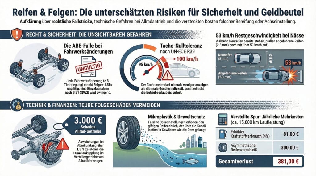 Sie haben im obigen Reifenrechner eine Radkombination berechnet, die laut Datenblatt optisch in den Radkasten passt? Herzlichen Glückwunsch. Aber Achtung: Das bedeutet noch lange nicht, dass Ihr Auto sicher oder legal ist. Willkommen im gefährlichsten juristischen Irrgarten der Fahrzeugtechnik.