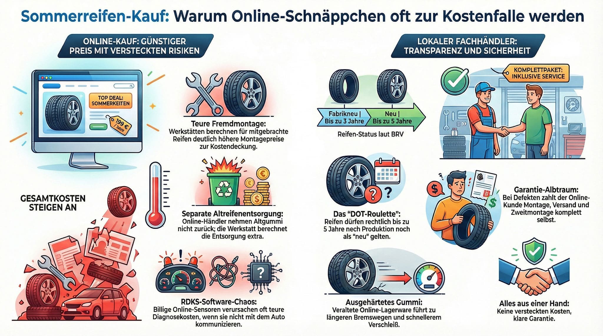 Das ist die größte Falle beim Online-Kauf. Hat der Reifen einen Produktionsfehler (z. B. einen Höhenschlag), haftet zwar der Internet-Shop für den Reifen selbst. Aber: Du musst die Werkstattkosten für das erneute Abziehen des Reifens, das Verpacken, den Rückversand und die spätere Neumontage komplett aus eigener Tasche bezahlen! Kaufst du den Reifen bei uns, übernehmen wir die komplette Reklamationsabwicklung stressfrei für dich.